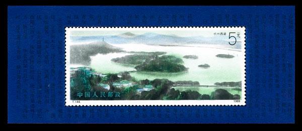 5元,杭州西湖,1020万枚。 1989.11.25。影写版。P11.5×11。[G]。 小型张规格:145mm×60mm。邮票规格:90mm×40mm。 [D]杨明义。北京邮票厂。