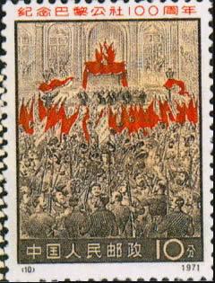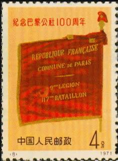 (8)主图是保存至今的当年巴黎公社使用过的一面红旗,旗子上印有文字。(9)主图再现了巴黎无产阶级当年高举武器、揭竿而起的情形。(10)主图上巴黎公社的社员正集结在一起,宣告第一个无产阶级革命政权的诞生。(11)主图上红旗飞舞,群情激昂,巴黎公社社员集结在国际广场上,决心保卫公社,保卫革命。