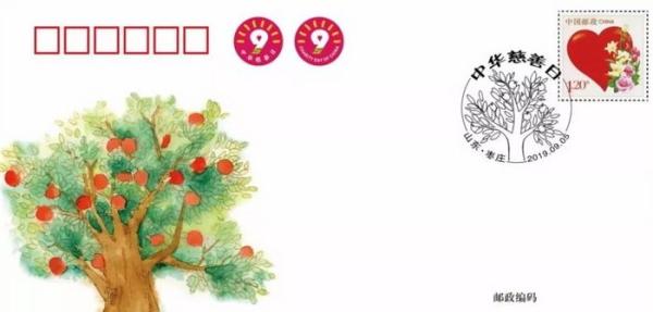 纪念封图案以中华慈善日标志和硕果累累的大树组成,寓意我国慈善事业将坚持党的领导,保障改善民生、促进社会和谐,走中国特色慈善事业发展之路,满足人民对美好生活需要的为民爱民之心。同时,还启用圆形纪念邮戳1枚。