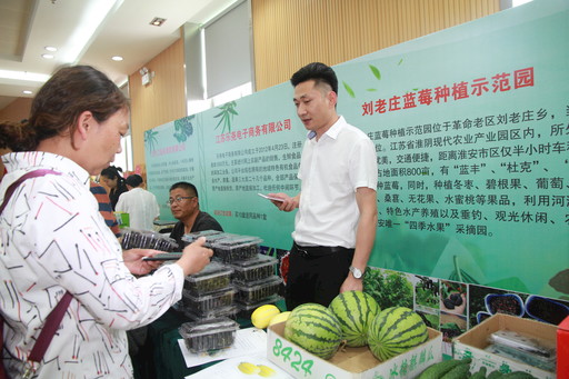 扶贫农产品展台前,客户纷纷咨询购买相关农产品。
