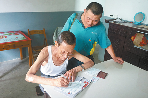 刘彩陆指导钟福炉老人填写取款单。