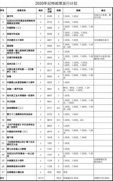 经国家邮政局审定,2020年纪特邮票发行计划27套,包括纪念邮票14套,特种邮票13套。选题涉及经济、政治、文化、社会、生态文明以及外交、体育等多个方面,较为全面反映国家生活各方面的成就与面貌。