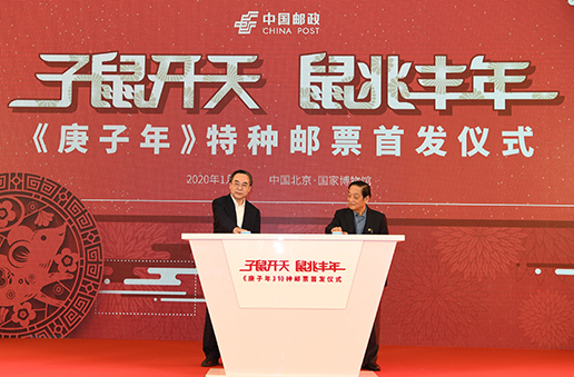 1月5日,《庚子年》特种邮票首发仪式在中国国家博物馆举行。该套邮票设计者、著名艺术家韩美林,中国邮政集团有限公司董事长刘爱力、国家博物馆馆长王春法等出席仪式。刘爱力与韩美林共同为《庚子年》特种邮票揭幕。