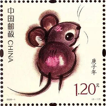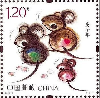 庚子鼠年生肖邮票第一图名为“子鼠开天”,取自民间传说“鼠咬天开”,萌动之鼠腾空跃起,咬破混沌,遂成宇宙,寓意国家取得了开天辟地、继往开来的巨大成就;第二图为“鼠兆丰年”,三只小鼠一副欢喜自得模样,寓意阖家欢乐,花生图案一派丰收景象,寓意2020年五谷丰登、阖家欢乐。画面运用装饰小写意的画法,结合传统国画的渲染技艺,展现了生肖鼠的可爱萌动,预示着伟大祖国的繁荣富强。