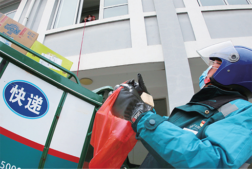 电话预告邮件递送,让楼房住户用绳带接收,避免了人与人的接触。