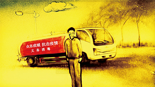 记者又问陈娜,知道他给消毒车队捐了20桶消毒液吗?陈娜摇摇头说,他不讲,但是我支持他。于是,她用自己的一技之长为他画了一幅沙画,名字就叫《消毒送安全 邮件送希望》。