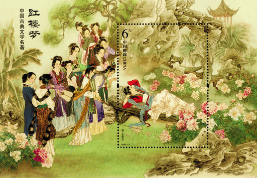5月17日发行的《中国古典文学名著——〈红楼梦〉(四)》特种邮票,4枚邮票内容分别为“鸳鸯抗婚”“宝琴立雪”“三姐还剑”“惑谗抄园”,小型张为“湘云眠芍”。由设计了该系列邮票第二组、第三组的著名工笔画家萧玉田继续担纲设计。