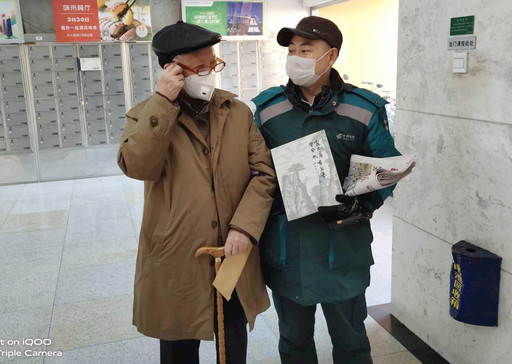 北京市西城区西外大街邮政支局投递员侯毅来自湖北,疫情防控期间,无法回家的他把对家乡的担心和牵挂化为对段道内百姓的贴心服务。面对激增的邮件,侯毅主动承担了两个投递道段的工作,每天从早上7点开始,一直忙到深夜。对于年龄较大的老年人更是特别关心,悉心了解他们的需求。图为侯毅服务社区的一位老人。□闫迪 吕薇 摄影报道