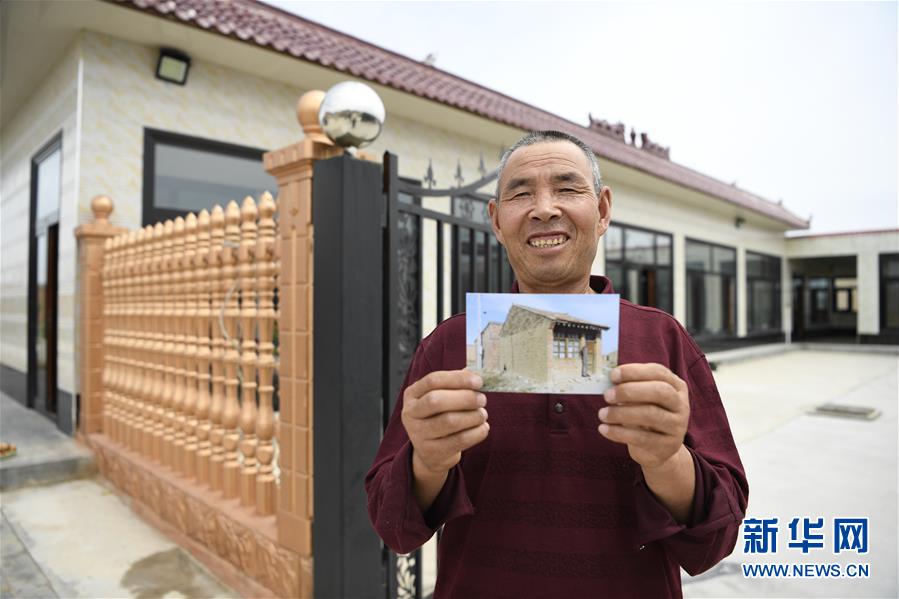 罗宗清在宁夏吴忠市红寺堡区新庄集乡康庄村的新家前展示以前老房子的照片(2019年7月24日摄)。他家于2001年从中卫市海原县搬迁到这里。 新华社记者 冯开华 摄