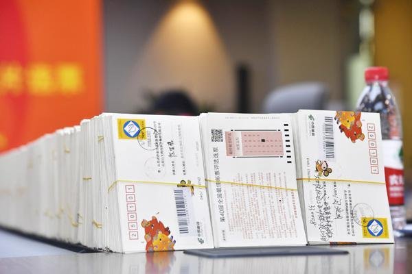 在公证人员的监督下,抽奖嘉宾和2名集邮爱好者共同在第40届全国最佳邮票评选邮资明信片选票中抽出“最佳幸运奖”50名。同时,赵晓光在选票号码的个位数尾号中抽出了 2、3、4、5、9为中奖号码。根据评选规则,投票者无论选对与否,只要投的选票尾号与5个中奖号码中任何一个相同,即为中奖。中奖者将获得第40届“佳邮”评选纪念张、发奖大会张、纪念封及本人参选寄出的选票明信片各一枚。