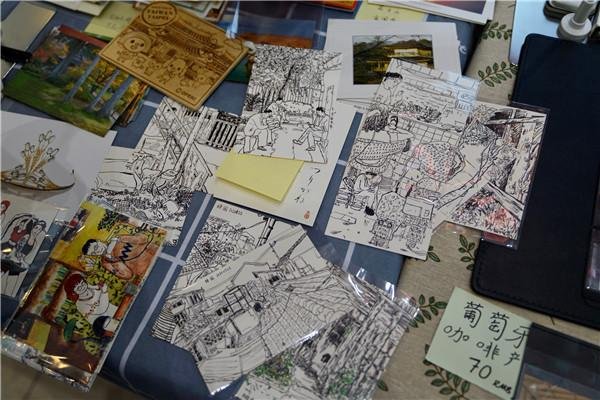 集市上有个“太阳岛”的摊位吸引了很多观众,这里的明信片都是手绘的,因为摊主乔安是素描爱好者。摊位上,最吸引观众的是她手绘上海每个角落的明信片,据乔安介绍,她会和小伙伴们一起去上海的角角落落去写生,平时在地铁上也会拿着小本子画车厢里的乘客,他们寻访了藏书楼、尼姑庵、书院等遗迹。还有一些是想象结合现实的素材绘制的。她画的最多的就是老城厢的人和街道,比如小南门、老西门一带。这一次她从日常积累的作品里筛选了17张印刷成了明信片,希望把自己捕捉到的旧世界和幻想中的场景展现给大家。