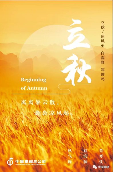 中国邮政曾于2018年8月7日发行过《二十四节气(三)》特种邮票1套6枚,邮票图案名称分别为:立秋、处暑、白露、秋分、寒露、霜降。“立秋”这枚邮票就表现了一家人围坐“贴秋膘”的温馨场景。