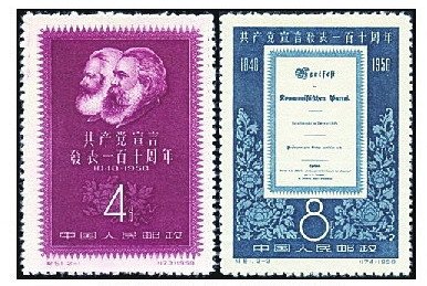 1958年7月1日,《共产党宣言发表一百十周年》纪念邮票发行,全套2枚(见左图)。第一枚“马克思和恩格斯像”,图案为充满睿智、蓄着胡须的马克思和恩格斯侧面像。第二枚“《共产党宣言》1848年德文版封面”,图案是由对称的牡丹花装饰画烘托着《共产党宣言》一书封面。这是纪念《共产党宣言》出版的一套专题邮票。1963年5月5日发行的《马克思诞生一四五周年》纪念邮票,其中第二枚“全世界无产者联合起来”,图案以《共产党宣言》1848年德文版封面为衬托,在鲜红的底色上,以醒目的金黄色“全世界无产者联合起来”这一战斗口号叠印在封面上,突出了这句口号的伟大意义。2018年5月5日发行的《马克思诞辰200周年》纪念邮票,其中第二枚“马克思与恩格斯像”,图案是一组马克思与恩格斯一坐一立的雕像,背景画面为《共产党宣言》德文版、中文版以及《资本论》中文版等马克思主义著作。这是《共产党宣言》中文版首次在中国邮票上亮相。