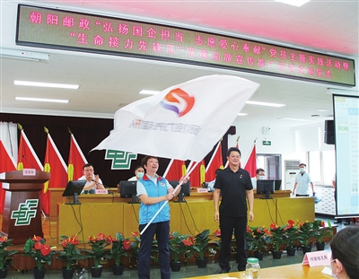 邮政志愿者代表高楠在启动仪式现场向广大邮政职工发出志愿倡议,并接过“生命接力先锋队”队旗。□李巍 摄