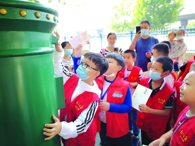 了解了邮票的功能和历史,小记者们还接到了设计一枚邮票、寄出一封信件的任务。有了前面的知识打底,大家很快就设计出了要素齐全的邮票。设计好的作品寄给谁呢?小记者们有的选择寄给自己,有的选择相互投递。在邮政大楼外投下信件后,青奥村小学林安琦说:“这可是我写的第一封信呢。今天不仅了解了邮票的故事,还学习了怎么写信,收获真不小。”