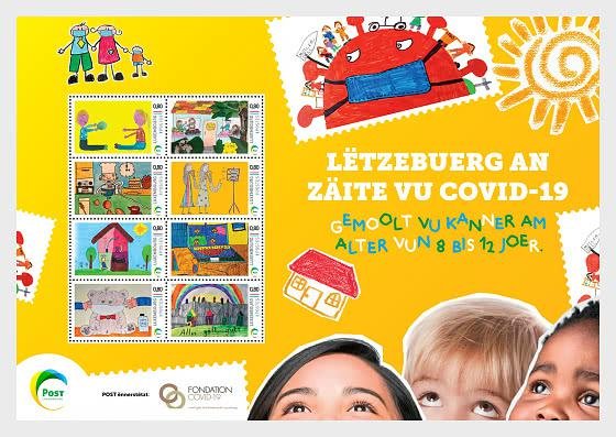 七八月的烈日骄阳似乎并未吓退新冠病毒,海外累计确诊数破千万,且多国呈复发之态,包括联合国邮政管理处在内的多个邮政,如卢森堡、巴西、格陵兰岛、根西岛、奥尔德尼岛等邮政继续发行抗击疫情邮票以鼓励民众再接再厉、同心战“疫”。卢森堡邮政于6月29日公布了COVID-19儿童绘画竞赛小全张邮票图案,内含八枚邮票,面值9.6欧元,表现的是儿童艺术竞赛获奖作品。卢森堡邮政在5月15日呼吁8-12岁儿童参加主题为“疫情封锁期间生活的一刻”绘画比赛。投稿截止至当月月底,8位优胜者的作品将成为特别邮票“COVID-19”主图,并将获得100欧元奖金。