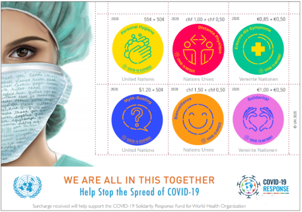 联合国邮政管理处原定于7月发行的《团结一致抗击新冠》附捐邮票小全张最终在8月11日面世,附捐款资将用于世卫组织的COVID-19团结应急基金会。小全张六枚邮票分别表现了世卫组织对全球公众的6项建议,以帮助阻止COVID-19的传播,包括个人卫生、打碎谣言、保持距离、传播善意、了解症状、团结一致。小全张下端的红色文字是“我们所有人团结在一起”,蓝色文字是“帮助阻止新冠病毒传播”。小全张边饰上,医护人员口罩上印有几十种不同文字的“谢谢”,既是对公众在疫情传播期间认真响应这6项倡议的由衷感谢,也对购买小全张表达爱心的善举表示感谢。