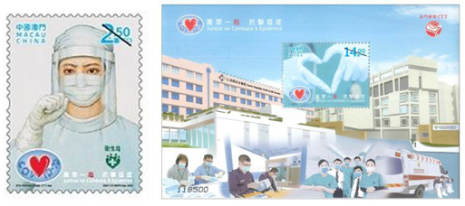 中国澳门邮电在6月24日增发《万众一心 抗击疫症》邮票、小型张各一枚。邮票设计延续写实风格,画面表现正如澳门邮电官方所述“社会各界、全体居民众志成城、齐心协力,积极支持和配合政府开展的防疫措施,展现了澳门人万众一心、抗击疫症的精神。在浓浓人情味的小城中,留下了一抹令人印象深刻的色彩。”。