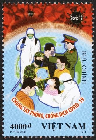 越南邮政紧随其后,于3月31日发行《携手预防和控制COVID-19病毒》邮票,以提高全民在预防、控制和决心扭转新冠病毒流行方面的认识和责任。该票一套两枚,分别为面值4000越南盾的“防控”和15000越南盾的“救治”。“防控”邮票图案展示了战斗在抗疫一线的医疗、部队和安全专业人士形象。他们是保护国家安全和人民健康的盾牌,正携手努力做好防控工作。“救治”邮票图案展示了医学人员不遗余力地研究寻找最佳治疗方法的画面。相关首日封、明信片、邮折等邮品也同期上市。