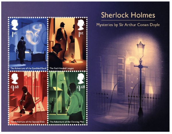 推出剧集套票的同时,英国皇家邮政还选取了原著作者阿瑟·柯南·道尔本人最满意的四个福尔摩斯故事发行小全张一枚,分别是《花斑带之谜》(收录在《冒险史》)、《红发会》、《第二血迹探案》、《小舞人探案》。小全张邮票主图采用著名概念艺术家卡罗利斯·斯特劳特涅卡斯(Karolis Strautniekas)创作的故事插画,边饰为标志性的贝克街221B号(福尔摩斯侦探事务所)门牌图案,构图经典、引人深思。