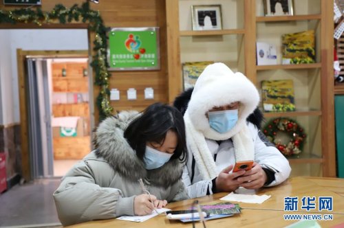 12月28日,游客在北极村邮政支局为亲友写明信片。