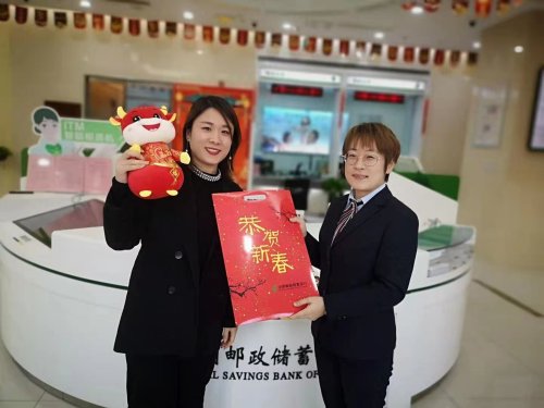 邮储银行山东省分行在牛年春节即将到来之际,为客户送上暖暖的节日祝福。图为淄博市分行在厅堂举办"金牛送福”抽奖活动,为来办业务的客户派送“小金牛”和福字对联礼包,营造良好的节日氛围。