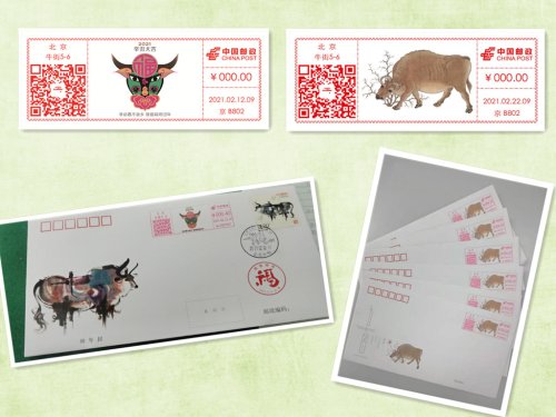 2月22日是辛丑年第一个辛丑日,北京邮政启用了第一枚《五牛图》邮资机彩色宣传戳,并首次尝试邮资机宣传戳产品线上定时寄预约实寄服务。