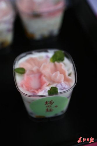 据了解,这种“樱花面”,是用特殊模具生产的樱花瓣形状的面片。在现场,几朵煮熟的樱花面片,就像一朵朵粉色的樱花,软软萌萌,很是可爱;与水果、芝士搭配,再点缀几片新鲜薄荷,这样的日系美食很受女孩喜欢。