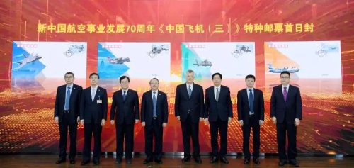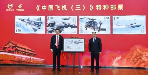 为庆祝中国共产党成立100周年、新中国航空事业发展70周年,4月17日,展现中国航空工业最新航空装备发展成就的《中国飞机(三)》特种邮票正式公开发行。在北京举行的首发仪式上,中国航空工业集团党组副书记李本正,中国邮政集团党组成员、副总经理康宁共同为邮票首发揭幕。中国集邮有限公司同步发行4枚《中国飞机(三)》首日封。