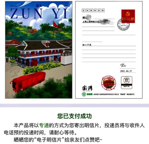 这套专属定制明信片由澎湃新闻设计师手绘制作,总共十张,包括上海、南昌、遵义、井冈山、瑞金、延安、北京、武汉、古田、西柏坡的标志性红色景点。此次首发在澎湃新闻“建党百年 初心之路”全媒体巡展贵州周的启动仪式上进行。参加每一站“澎湃新闻全媒体巡展”的观众都可以免费获得一张明信片。观众可写下对党的祝福,并盖上澎湃新闻定制的“红色景点打卡之旅”印章,贴在展示留言板上或带走留念。澎湃新闻全媒体巡展车队3月30日在上海中共一大纪念馆正式发车,4月29日来到贵州省遵义市,在遵义会议旧址附近的红军山广场举行贵州周展示的启动仪式。遵义是澎湃新闻此次全媒体巡展的第21个城市,一路上,澎湃新闻制作的这些明信片受到追捧。据不完全统计,目前贴在留言展板上的明信片已有逾千张,更多的参观者选择带走留念,总计超2万张。