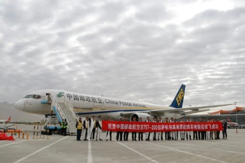 5月25日5点23分,一架喷涂着中国邮政航空的波音757-200飞机,从四川成都双流国际机场起飞,7点17分安全飞抵西藏拉萨贡嘎国际机场,后续按计划顺利完成在拉萨贡嘎机场全发起飞、进近以及模拟单发失效复飞等计划验证科目。至此,由民航北京监督管理局组织的中国邮政航空高高原和RNP AR程序验证试飞取得了圆满成功,在西藏和平解放70周年之际,“祝贺中国邮政航空B757-200拉萨机场高高原航线实地验证试飞成功”的横幅,在高原上猎猎展开。