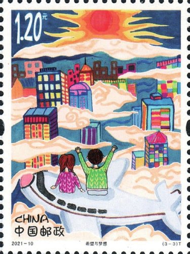 登上《儿童画作品选》特种邮票的3幅作品“我的中国梦”“国粹之韵”和“希望与梦想”,分别由上海市同济小学的杨晓芒、合肥新站寿春实验中学的费玉婷、上海市周浦第三小学的钱昕逸3位小朋友设计。第一枚通过描绘我国航空航天事业、城市、交通网络繁荣发展等场景,表达了少年儿童不断追寻探索宇宙的梦想以及对未来美好生活的憧憬;第二枚描绘了传统文化与城市发展、现代科技共繁荣的场景,表达了少年儿童对中华优秀文化的热爱与传承;第三枚描绘了伟大祖国不断发展的场景,少年儿童登高望远、憧憬未来。三枚邮票紧密围绕主题,展现出少年儿童对党领导下的伟大祖国的无比热爱、由衷礼赞和美好祝愿。