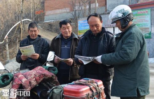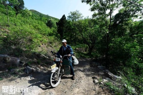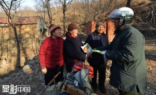 董乃军(右)在大马峪村投递,他的摩托车一停,会吸引来许多村民。尽管作为一名农村邮递员待遇不高,但他已经成为这条邮路上不变的风景,山里的村民更是离不开他,他说:“我很热爱自己的这份投递工作,我舍不得山里的人们,我会一直沿着这条邮路走下去。”