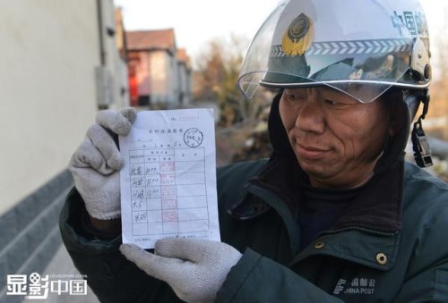 在他的这条邮路上,有5个邮政排单的盖章点,他每天都会认认真真的盖完。图为董乃军在张家洞村展示已经盖完印章的排单。