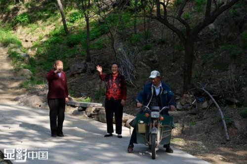董乃军负责200多个投递点,他每天需要带着近百十斤重的邮包,翻越十几座山头为村民投递,38年的时间已经丈量了一百多万公里的山路,骑坏了十几辆自行车,但从没有因为天气原因或自己的疏忽懈怠而耽误任何邮件的投递,实现了38年无差错。图为董乃军从村里离开时,老人们和他挥手告别。