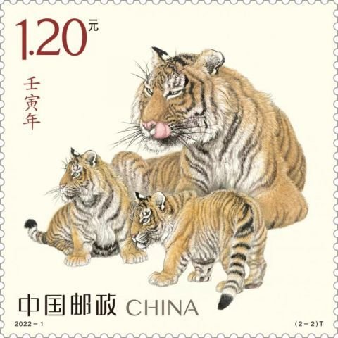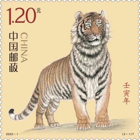 2022《壬寅年》生肖虎邮票一套两枚,分别诠释了“国”与“家”的概念。第一枚邮票名为“国运昌隆”,描绘了一只气宇轩昂的上山虎形象,矗立远眺、志存高远,传达出国家蒸蒸日上、雄心壮志的含义;第二枚邮票名为“虎蕴吉祥”,描绘了面容温婉的虎妈妈带着两只小虎的温馨场景,寓意儿孙兴旺、家庭美满。2022《壬寅年》特种邮票是中国生肖邮票第四轮中的第七套,设计者为以画虎闻名的我国著名画家冯大中。