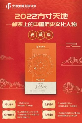 中国集邮有限公司同时推出2022集邮日历典藏版《方寸天地——邮票上的中国历史文化人物》,以时间为经、以史事为纬、以邮票为媒,将已发行邮票上的138位中国历史文化人物及相关的故事、作品按照历史脉络呈现,收入中国历史文化人物、节日、节气、生肖相关邮票图稿129套423枚、首日封图稿及设计原稿12枚、明信片图稿12枚。