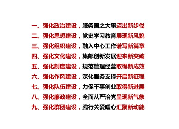 针对以上短板和不足,全公司要深刻把握和遵循党建工作规律,坚持六个“体现”、一个“要”,全面提升党建质量和科学化水平。党的建设高质量要体现在政治统领、文化引领的新理念上;体现在求真务实、风清气正的新常态上;体现在集邮复兴、我的责任的新担当上;体现在干事创业、奋勇争先的新作为上;体现在改进管理、提质增效的新突破上;体现在凝心聚力、共谋发展的新成效上,要充分发挥党组织的领导核心和政治核心作用,明方向、聚人心、兴文化、展形象,激发全员创新创造活力,以高质量党建统领企业高质量发展新征程,为集邮复兴保驾护航。