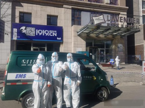 14时36分,邮车到达隔离点——镇赉县薰衣草宾馆。投递人员下车后第四次对药物邮件进行消毒,最终将药物送到集中隔离点工作人员处,由他们转交到孩子手中。