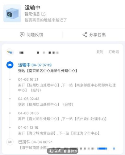 周爸爸查询了信息,今天上午7点,邮件已经到达南京邮区中心局邮件处理中心,预计今天就能送达目的地。