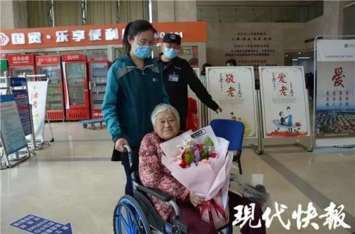 " 奶奶,我来接您了。"4 月 6 日上午 9 点,林晓芳将一大束鲜花送到老人手中,祝愿她早日康复。接着,他让同行的丈夫在一旁照看老人,自己则在急诊和住院部往返数次,帮老人办理出院手续、拿药、租轮椅。将老人扶上车,已是下午 1 点半,此时林晓芳才感觉自己又渴又饿,水都没顾上喝一口。