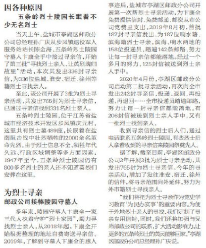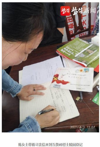 “爷爷,70多年了,我们终于找到您了!”4月3日,江苏省盐城市阜宁沟墩三合村陈必虎烈士的侄孙女陈女士来到五条岭烈士陵园内祭扫,她拿着收到的寻亲信痛哭不已,她说终于圆了一家几代人、74年的寻亲梦。五条岭烈士陵园长眠着不少无名烈士,3批为烈士寻亲活动共发出765封为烈士寻亲信,已通过寻亲信找到331名烈士亲人。