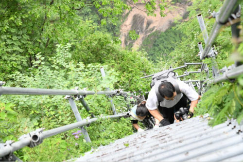 等山脚下的村民把包裹都取走后,某色尔者将居住在悬崖村山顶上的村民的邮件装进邮包,随即开启了攀登2556级钢梯的“天梯”送邮之路。相较于采访组的兴奋,某色尔者只是默默地检查邮包,唯一不同的是多了一份对采访组成员安全的担心。