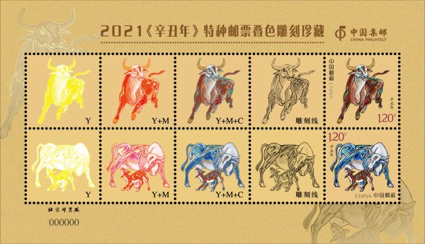 叠色,反映了邮票印制的套色过程。雕刻,是对邮票图案进一步创作的过程。我国生肖邮票的第一、二、四轮,均采用叠色加雕刻的方式进行印刷,深受广大集邮爱好者的喜爱。为了推广集邮文化,充分展示邮票的印制和雕刻印刷过程,市场营销部在2021年推出《辛丑年》特种邮票叠色雕刻样张,0.02克纯金,以供广大集邮爱好者珍藏。