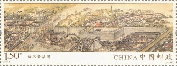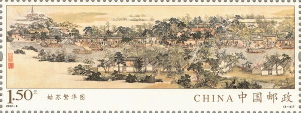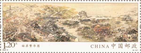 《姑苏繁华图》是清代宫廷画家徐扬历时20多年创作的恢宏长卷画作。我采用了横长票幅设计,展现了古画精致细微又壮阔宏大的盛世景象。 2022年1月,我接到了这套邮票的设计任务,当时共有近10名设计师参与了设计竞争。最后,我的设计方案幸运地在众多方案中被选中。 第一次接触古代名画题材邮票的设计,个人觉得最难的是给古画的电子文件进行色彩调整。在处理色彩时,既要尽可能恢复古画的原貌,又要使整个画面细节丰富,层次清晰。如果色彩太明快,容易丢失晕染的细节;如果色彩太厚重,虽然会使画面带有历史沧桑感,但又会让画面整体浑浊不清。我在设计时特意选用了邮票内图左右两边都不“出血”的票图形式,这样把任何两枚邮票放在一起时,也不会因为画面不连贯而令观者对原画长卷产生误解。 全张票共有3版,每版全张票的边饰都选择了相应邮票在原画长卷中的位置的局部放大图,同时又在颜色上做了弱化处理,使边饰图案在视觉上不会夺走邮票自身的风采。这次设计的过程十分烦琐,为了调整出令人满意的色彩,裁切出美观的构图,我做了无数次的尝试,一直达到令我最满意的效果才停下。一套邮票的诞生是集体心血和智慧的结晶,感谢我的领导和同事们的大力支持和无私帮助,尤其感谢邮票设计前辈王虎鸣先生的悉心指点。