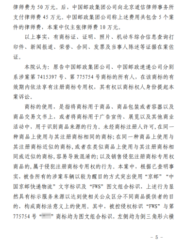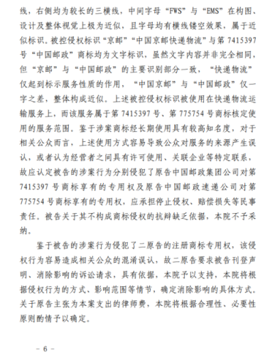 ”“中国邮政”商标构成近似,且涉案商标使用在物流运输服务上,对于公众而言容易导致对服务来源的误认或认为经营者之间具有许可使用、关联企业等特定关系,遂判令被告立即停止侵权行为、在《北京日报》上公开赔礼道歉并赔偿中国邮政1万元合理开支。