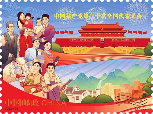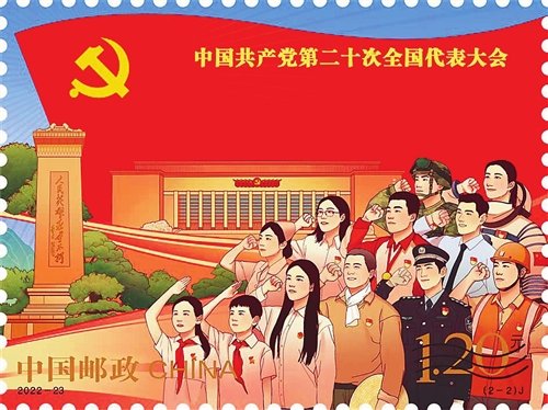 中国邮政定于2022年10月16日发行《中国共产党第二十次全国代表大会》纪念邮票一套2枚、小型张1枚。邮票第一图名称为“奋进新征程”,第二图名称为“建功新时代”,小型张图案名称为“庆祝中国共产党第二十次全国代表大会胜利召开”。全套邮票面值为8.40元。邮票计划发行1390万套,小型张计划发行790万枚。