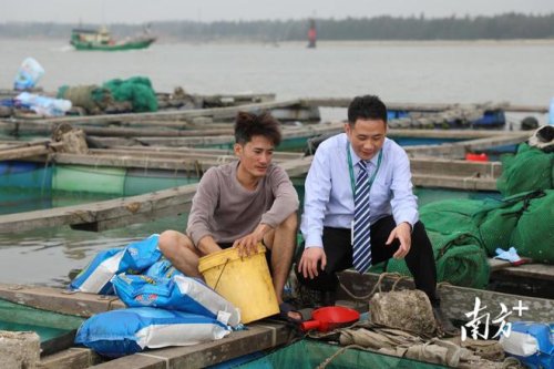 邮储银行广东省分行客户经理登上鱼排与渔民交流。