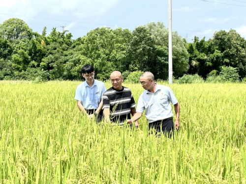 邮储银行赣州市分行客户经理刘巍与客户一同察看水稻种植情况