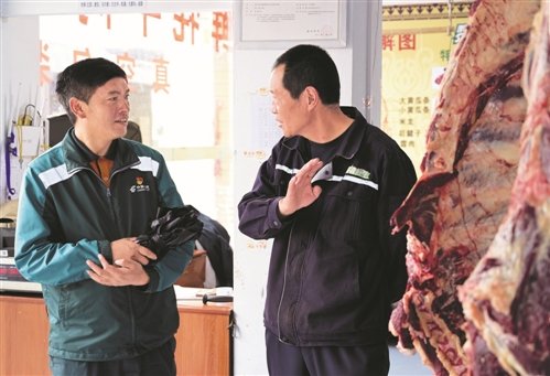 哈弄夺机向牦牛肉商户了解最新的市场行情。□新华社记者 李贺 摄